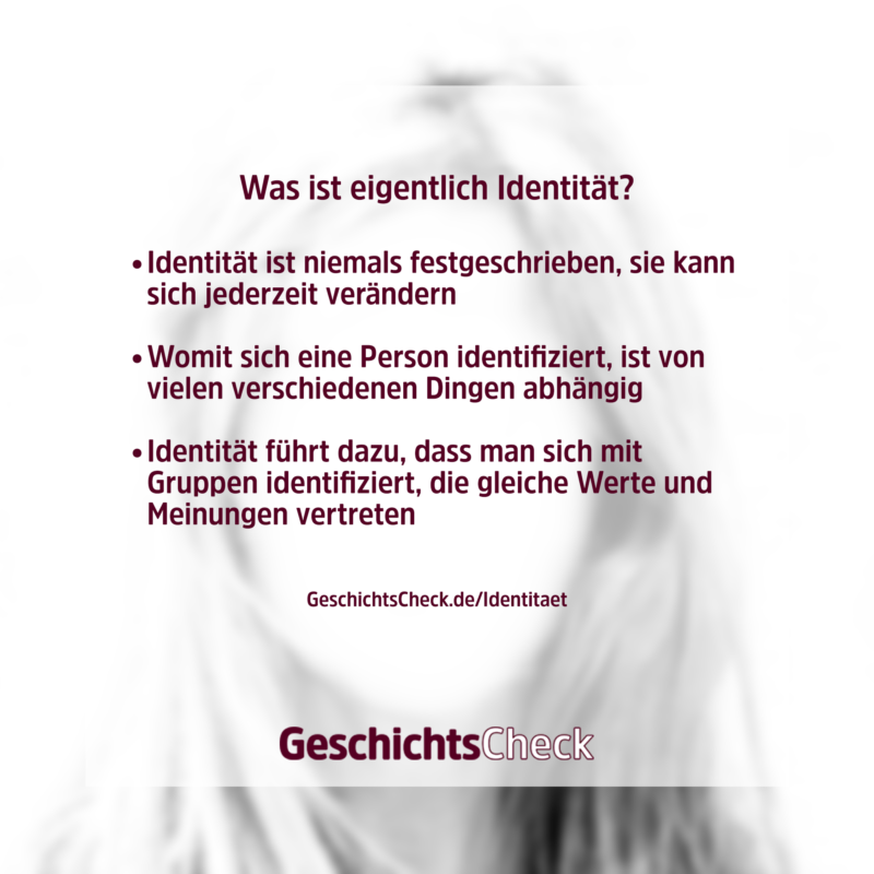 Die Identität einer Person ist demnach nicht festgeschrieben – weder die Identität, die sich die Person selbst gibt, noch die, die ihr durch ihr Umfeld zugeschrieben wird. Jeder kann seine Identität verändern, indem er zum Beispiel seine Überzeugungen oder seine Definition davon ändert, wer als deutsch gilt und wer nicht. Das bedeutet aber auch, dass es keine klare Definition davon gibt, was als deutsche Identität angesehen wird und was nicht. Solche Definitionen werden immer durch die jeweilige Person oder Gruppe bestimmt.